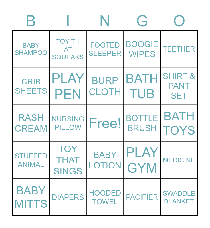 This bingo card has a free space and 39 words: BABY POWDER, SOCKS OR BOOTIES, GROOMING SUPPLIES, PLAY PEN, BABY MITTS, BABY LOTION, BURP CLOTH, BABY BOTTLE, TEETHER, STUFFED ANIMAL, NURSING PILLOW, BOOGIE WIPES, SWADDLE BLANKET, BATH TOYS, BOTTLE BRUSH, TOY THAT SINGS, BABY HAT, BABY SHAMPOO, DINO THEMED ITEM, PLAY GYM, CRIB SHEETS, HOODED TOWEL, BATH TUB, SHIRT & PANT SET, BABY BOOK, NURSERY DECOR, CHANGING PAD, BABY CARRIER, BABY MONITOR, TOY THAT SQUEAKS, WASH CLOTH, ONESIE, FOOTED SLEEPER, DIAPERS, PACIFIER, BABY BIB, MEDICINE, RASH CREAM and DIAPER WIPES.