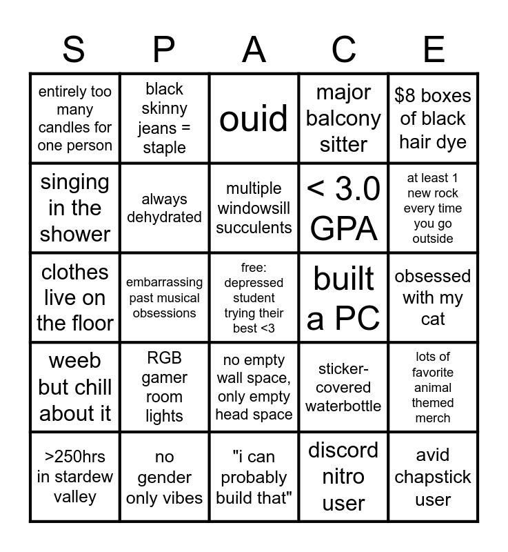 This bingo card has a free space and 24 words: RGB gamer room lights, no gender only vibes, multiple windowsill succulents, >250hrs in stardew valley, $8 boxes of black hair dye, entirely too many candles for one person, singing in the shower, black skinny jeans = staple, built a PC, no empty wall space, only empty head space, < 3.0 GPA, clothes live on the floor, sticker-covered waterbottle, lots of favorite animal themed merch, always dehydrated, discord nitro user, obsessed with my cat, ouid, at least 1 new rock every time you go outside, embarrassing past musical obsessions, avid chapstick user, weeb but chill about it, major balcony sitter and "i can probably build that".