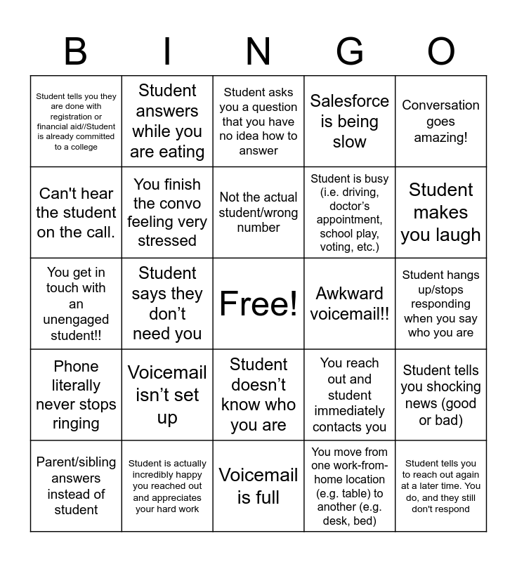 This bingo card has a free space and 25 words: Voicemail isn’t set up, Voicemail is full, Not the actual student/wrong number, Parent/sibling answers instead of student, Conversation goes amazing!, Student tells you they are done with registration or financial aid//Student is already committed to a college, Can't hear the student on the call., Student answers while you are eating, Awkward voicemail!!, Student doesn’t know who you are, Student is busy (i.e. driving, doctor’s appointment, school play, voting, etc.), You get in touch with an unengaged student!!, You reach out and student immediately contacts you, Student tells you shocking news (good or bad), You finish the convo feeling very stressed, Student has been “meaning to reach out to you”, Student hangs up/stops responding when you say who you are, Student asks you a question that you have no idea how to answer, Student makes you laugh, Student says they don’t need you, Student tells you to reach out again at a later time. You do, and they still don't respond, Student is actually incredibly happy you reached out and appreciates your hard work, Phone literally never stops ringing, Salesforce is being slow and You move from one work-from-home location (e.g. table) to another (e.g. desk, bed).