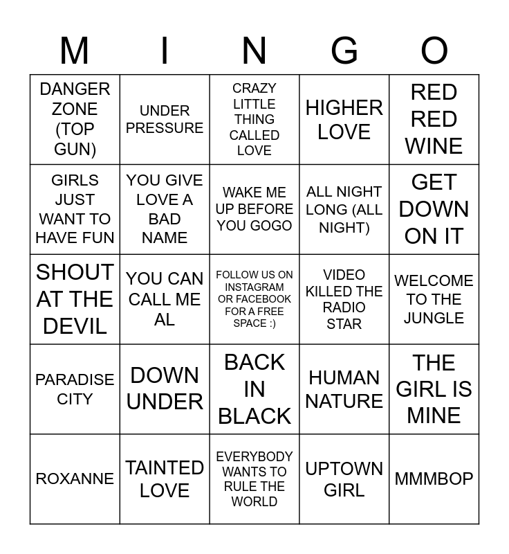This bingo card has a free space and 52 words: I WANT YOU TO WANT ME, MMMBOP, I CAN'T HELP MYSELF (SUGAR PLUM HONEY), EVERYBODY WANTS TO RULE THE WORLD, DOWN UNDER, I WANNA DANCE WITH SOMEBODY, UNDER PRESSURE, DON'T YOU (FORGET ABOUT ME), GIRLS JUST WANT TO HAVE FUN, YOU MAKE MY DREAMS (COME TURE), YOU GIVE LOVE A BAD NAME, WE BUILT THIS CITY, THE GIRL IS MINE, HUMAN NATURE, NEVER GONNA GIVE YOU UP, FUNKY TOWN, WAKE ME UP BEFORE YOU GOGO, VIDEO KILLED THE RADIO STAR, BREAK MY STRIDE, RED RED WINE, YOU CAN CALL ME AL, UPTOWN GIRL, DANGER ZONE (TOP GUN), ALL NIGHT LONG (ALL NIGHT), WALK THIS WAY, YOU SPIN ME ROUND, WHAT'S LOVE GOT TO DO WITH IT, WHITE WEDDING, GET DOWN ON IT, HERE I GO AGAIN 87, LIKE A VIRGIN, HIGHER LOVE, A LITTLE RESPECT, LOVE SHACK, 99 RED BALLOONS, CRAZY LITTLE THING CALLED LOVE, TAINTED LOVE, HEAVEN IS A PLACE ON EARTH, EVERY LITTLE THING SHE DOES IS MAGIC, EVERY BREATH YOU TAKE, STAR WARS (MAIN THEME), WELCOME TO THE JUNGLE, PARADISE CITY, SWEET CHILD O' MINE, BACK IN BLACK, DR. FEELGOOD, GIRLS, GIRLS, GIRLS, SHOUT AT THE DEVIL, ROCK YOU LIKE A HURRICANE, PANAMA, ROXANNE and BOHEMIAN RHASODY.