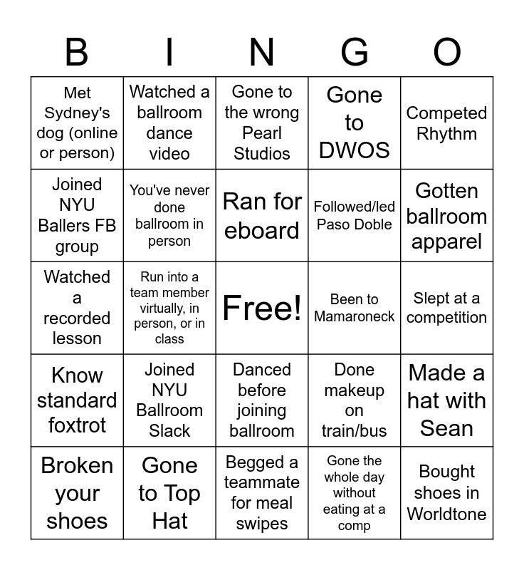 This bingo card has a free space and 43 words: Lost something in 606, Bought shoes in Worldtone, Had a bad comp housing situation, Broken your shoes, Witnessed Meagan's dog wreaking havoc in newcomer lessons, Gone the whole day without eating at a comp, Gone to the wrong Pearl Studios, Back led someone, Competed Rhythm, Gone to Top Hat, Gone to DWOS, Been to Mamaroneck, Danced before joining ballroom, Joined NYU Ballroom Slack, Tripped whilst dancing, Begged a teammate for meal swipes, Gotten a rad team jacket, Watched a recorded lesson, Submitted a clip for a newcomer choreography video, Gotten ballroom apparel, Watched a ballroom dance video, Attended a virtual dance lesson, In Big/Little, Met Sydney's dog (online or person), Done homework at a comp, Slept at a competition, Missed a bus, Been invigilated, Done makeup on train/bus, Know standard foxtrot, Know fan/hockey stick, Made a hat with Sean, Helped someone at open practice, Run into a team member virtually, in person, or in class, Spotted an NYU jacket from afar, Dance with alumni, Fallen in love with a competition dress/outfit, Ran for eboard, Joined NYU Ballers FB group, Followed/led Paso Doble, Danced with Jennifer or Stanley, You've never done ballroom in person and Had Jennifer, Sean, Stanley, or Meagan give you feedback.