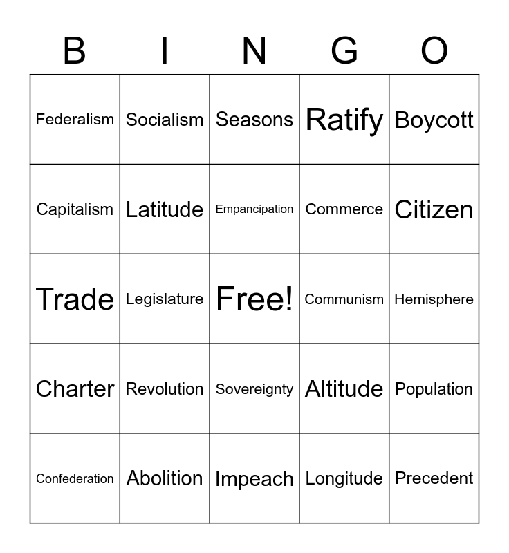 This bingo card has a free space and 24 words: Revolution, Abolition, Empancipation, Confederation, Boycott, Federalism, Capitalism, Socialism, Communism, Sovereignty, Commerce, Trade, Altitude, Population, Latitude, Longitude, Hemisphere, Seasons, Citizen, Legislature, Precedent, Charter, Ratify and Impeach.