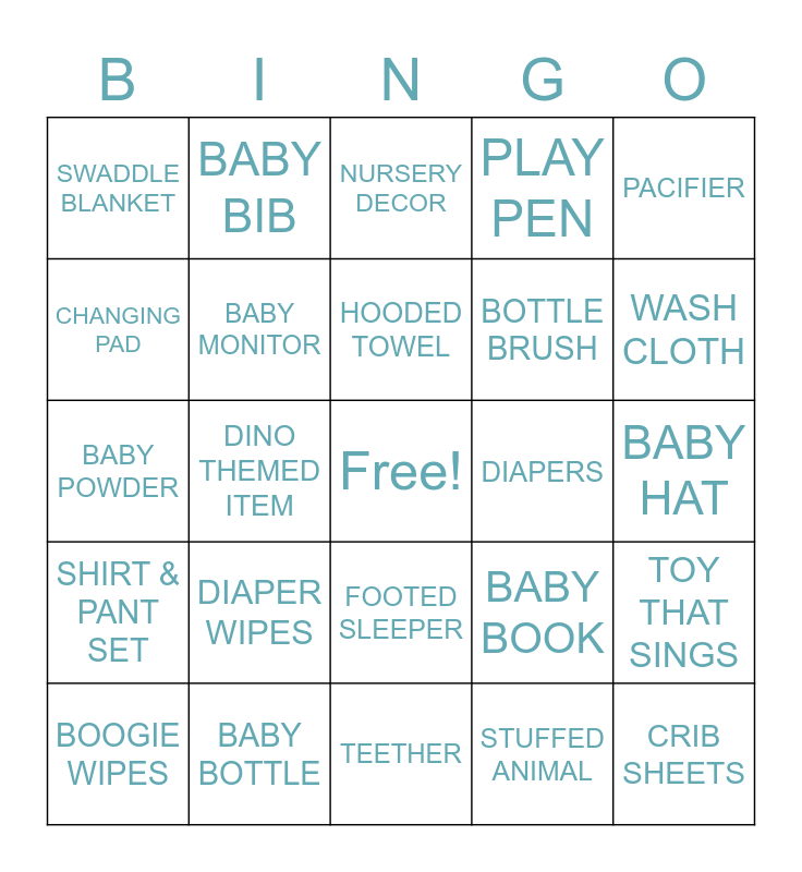 This bingo card has a free space and 39 words: BATH TOYS, ONESIE, BABY SHAMPOO, BABY MONITOR, BOOGIE WIPES, FOOTED SLEEPER, HOODED TOWEL, BABY LOTION, PACIFIER, SHIRT & PANT SET, DINO THEMED ITEM, PLAY PEN, CRIB SHEETS, BABY HAT, DIAPERS, DIAPER WIPES, BATH TUB, SWADDLE BLANKET, TOY THAT SQUEAKS, BABY BOOK, CHANGING PAD, TEETHER, BOTTLE BRUSH, WASH CLOTH, PLAY GYM, BABY GROOMING KIT, BABY MITTS, NURSING PILLOW, RASH CREAM, BABY BIB, BABY CARRIER, BURP CLOTH, NURSERY DECOR, BABY BOTTLE, STUFFED ANIMAL, MEDICINE, TOY THAT SINGS, BABY POWDER and SOCKS OR BOOTIES.