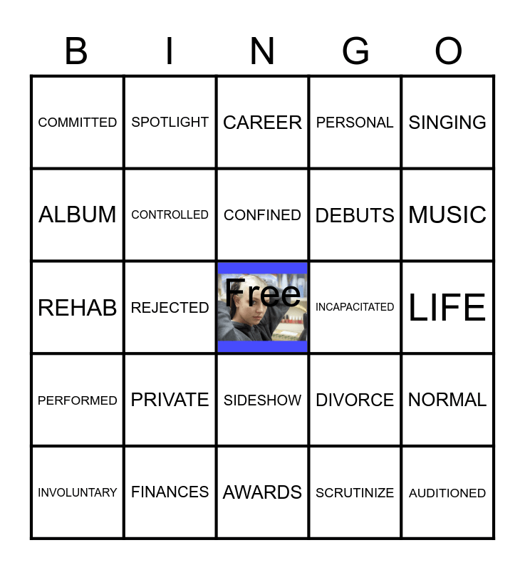This bingo card has a free space and 38 words: BIPOLAR, OVERPROTECTED, OVERWHELMED, CONTROLLED, NORMAL, PRIVATE, CONFINED, COMATOSE, SINGING, DEBUTS, REJECTED, PERSONAL, AUDITIONED, LIFE, ALBUM, PERFORMED, TOUR, CAREER, ENCOUNTER, INCAPACITATED, COMMITTED, FINANCES, MUSIC, INVOLUNTARY, CONSERVATORSHIP, AWARDS, HEALTH, ANXIETY, CROSSROADS, SINGLES, HOLLYWOOD, SIDESHOW, SCRUTINIZE, SPOTLIGHT, CAMERA, DIVORCE, REHAB and SUSPENDED.