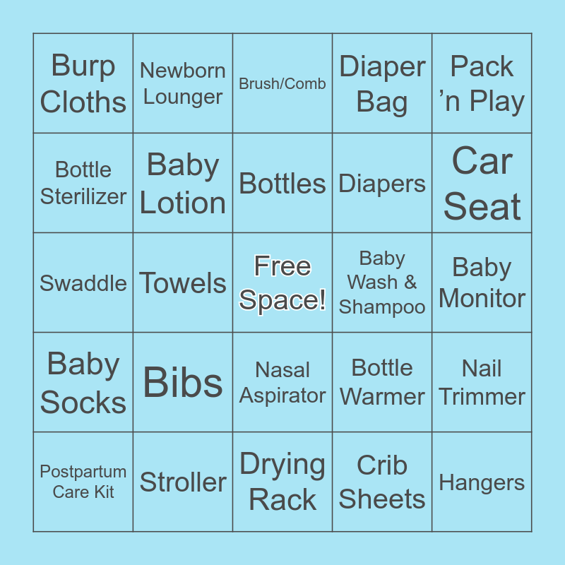 This bingo card has a free space and 42 words: Crib Pad Cover, Bottles, Pacifiers, Bibs, Crib Sheets, Nail Trimmer, Hangers, Wipes, Brush/Comb, Nasal Aspirator, Baby Monitor, Car Seat, Towels, Pack ’n Play, Book, Bottle Warmer, Blankets, Swaddle, White Noise Machine, Newborn Lounger, Bottle Sterilizer, Changing Pad, Baby Carrier, Burp Cloths, Breast Pump, Diaper Cream, Diapers, Onesie, Baby Clothes, Baby Mittens, Feeding Pillow, Baby Socks, Baby Lotion, Drying Rack, Stuffed Animal, Postpartum Care Kit, Stroller, Baby Wash & Shampoo, Baby Shoes, Baby Toys, Diaper Bag and Stroller.
