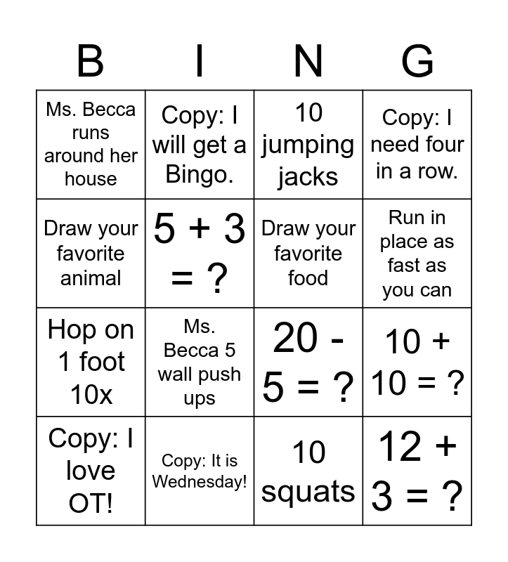 This bingo card has 16 words: Copy: It is Wednesday!, 10 + 10 = ?, 10 jumping jacks, Ms. Becca runs around her house, Hop on 1 foot 10x, Copy: I will get a Bingo., 20 - 5 = ?, 10 squats, Draw your favorite animal, 5 + 3 = ?, Copy: I love OT!, Copy: I need four in a row., Ms. Becca 5 wall push ups, Run in place as fast as you can, Draw your favorite food and 12 + 3 = ?.