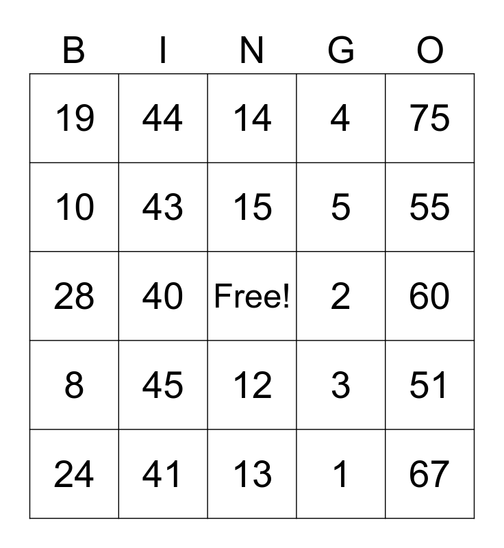 This bingo card has a free space and 24 words: 24, 45, 15, 1, 75, 19, 44, 14, 2, 60, 28, 43, 3, 51, 10, 41, 13, 4, 55, 8, 40, 12, 5 and 67.