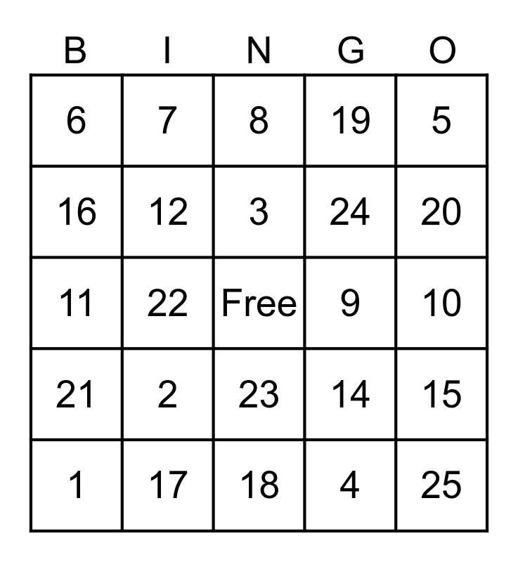 This bingo card has a free space and 24 words: 1, 2, 3, 4, 5, 6, 7, 8, 9, 10, 11, 12, 14, 15, 16, 17, 18, 19, 20, 21, 22, 23, 24 and 25.