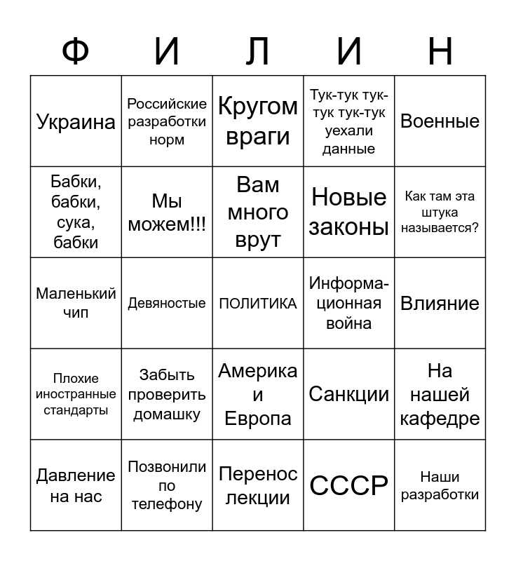 This bingo card has a free space and 24 words: Забыть проверить домашку, Позвонили по телефону, Вам много врут, Давление на нас, Военные, Украина, Бабки, бабки, сука, бабки, Российские разработки норм, Информа-ционная война, Америка и Европа, Новые законы, Маленький чип, Санкции, На нашей кафедре, Мы можем!!!, СССР, Влияние, Кругом враги, Как там эта штука называется?, Девяностые, Наши разработки, Плохие иностранные стандарты, Тук-тук тук-тук тук-тук уехали данные and Перенос лекции.