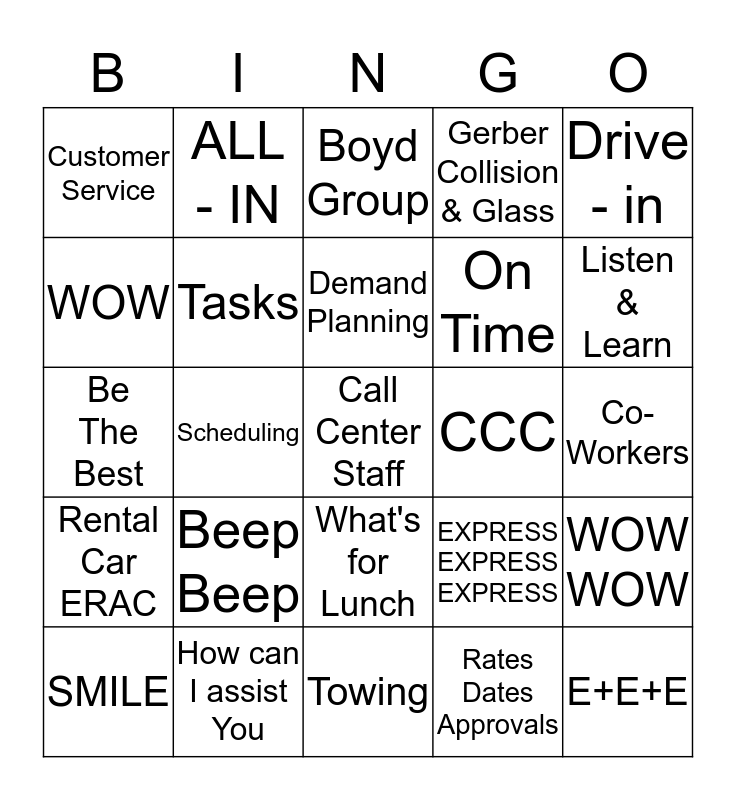 This bingo card has 25 words: Beep Beep, Towing, Demand Planning, SMILE, Drive - in, Customer Service, WOW, ALL - IN, CCC, What's for Lunch, On Time, Be The Best, EXPRESS EXPRESS EXPRESS, WOW WOW, Tasks, E+E+E, Co-Workers, Boyd Group, Listen & Learn, Scheduling, Call Center Staff, How can I assist You, Rental Car ERAC, Gerber Collision & Glass and Rates Dates Approvals.
