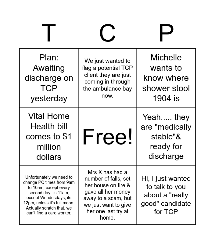 This bingo card has a free space and 8 words: Yeah..... they are "medically stable"& ready for discharge, Michelle wants to know where shower stool 1904 is, We just wanted to flag a potential TCP client they are just coming in through the ambulance bay now., Unfortunately we need to change PC times from 9am to 10am, except every second day it's 11am, except Wendesdays, its 12pm, unless it's full moon. Actually scratch that, we can't find a care worker., Plan: Awaiting discharge on TCP yesterday, Hi, I just wanted to talk to you about a "really good" candidate for TCP, Vital Home Health bill comes to $1 million dollars and Mrs X has had a number of falls, set her house on fire & gave all her money away to a scam, but we just want to give her one last try at home..