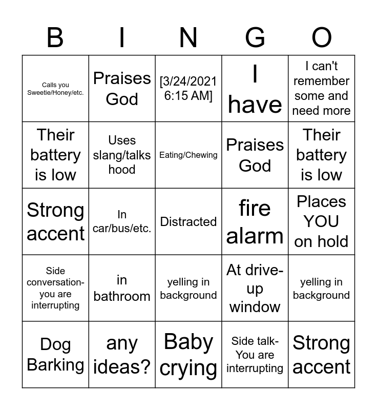 This bingo card has 43 words: Free!, Distracted, At drive up window, Dog Barking, Loud Music, Side talk-You are interrupting, [3/24/2021 6:15 AM], fun bingo was your idea - I am again (3rd time) trying to create it, I can't remember some and need more, any ideas?, I have, fire alarm, yelling in background, in bathroom, In car/bus/etc., Baby crying, TP is sleeping, Strong accent, Eating/Chewing, Their battery is low, Praises God, Uses Ma'am/Sir, Uses slang/talks hood, Calls you Sweetie/Honey/etc., At drive-up window, Places YOU on hold, At work, Dog Barking, At drive-up window, Side conversation- you are interrupting, fire alarm, yelling in background, in bathroom, In car/bus/etc., Baby crying, TP is sleeping, Strong accent, Eating/Chewing, Their battery is low, Praises God, Uses Ma'am/Sir, Uses slang/talks hood and Loud music.