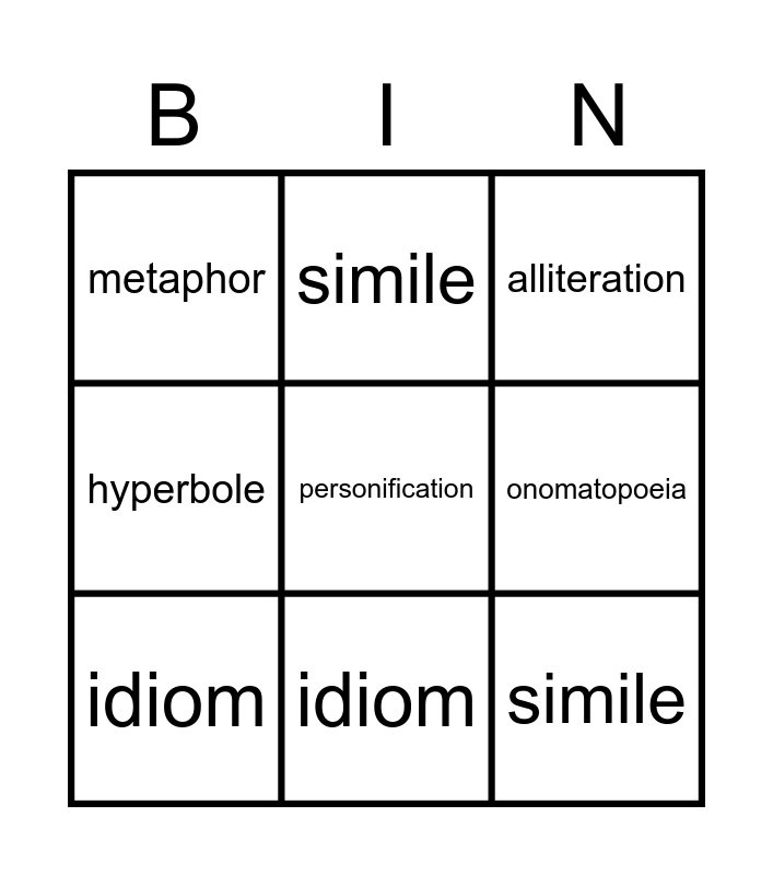 This bingo card has 9 words: idiom, alliteration, simile, hyperbole, metaphor, onomatopoeia, personification, simile and idiom.