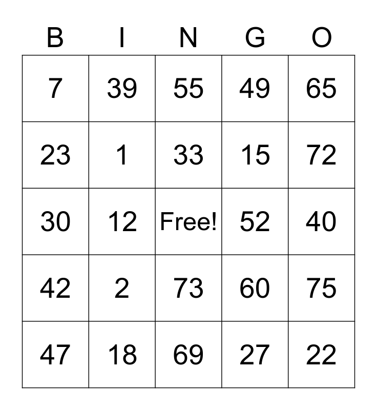 This bingo card has a free space and 24 words: 2, 18, 33, 47, 65, 7, 23, 39, 52, 73, 15, 30, 60, 75, 1, 27, 40, 55, 72, 12, 22, 42, 49 and 69.