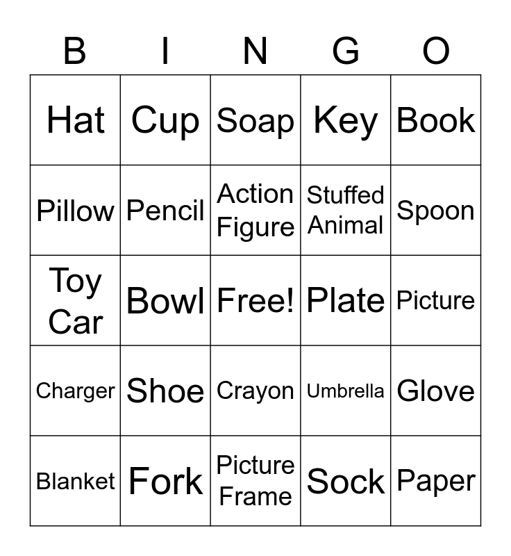 This bingo card has a free space and 24 words: Shoe, Fork, Action Figure, Blanket, Book, Hat, Pillow, Cup, Plate, Crayon, Stuffed Animal, Toy Car, Umbrella, Glove, Pencil, Sock, Picture, Soap, Spoon, Bowl, Paper, Charger, Key and Picture Frame.