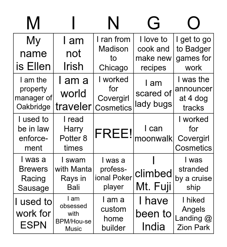 This bingo card has a free space and 24 words: I swam with Manta Rays in Bali, I am obsessed with BPM/Hou-se Music, I worked for Covergirl Cosmetics, I used to work for ESPN, I get to go to Badger games for work, My name is Ellen, I am the property manager of Oakbridge, I am not Irish, I can moonwalk, I was a profess-ional Poker player, I am scared of lady bugs, I used to be in law enforce-ment, I climbed Mt. Fuji, I was stranded by a cruise ship, I am a world traveler, I have been to India, I worked for Covergirl Cosmetics, I ran from Madison to Chicago, I was the announcer at 4 dog tracks, I read Harry Potter 8 times, I hiked Angels Landing @ Zion Park, I was a Brewers Racing Sausage, I love to cook and make new recipes and I am a custom home builder.