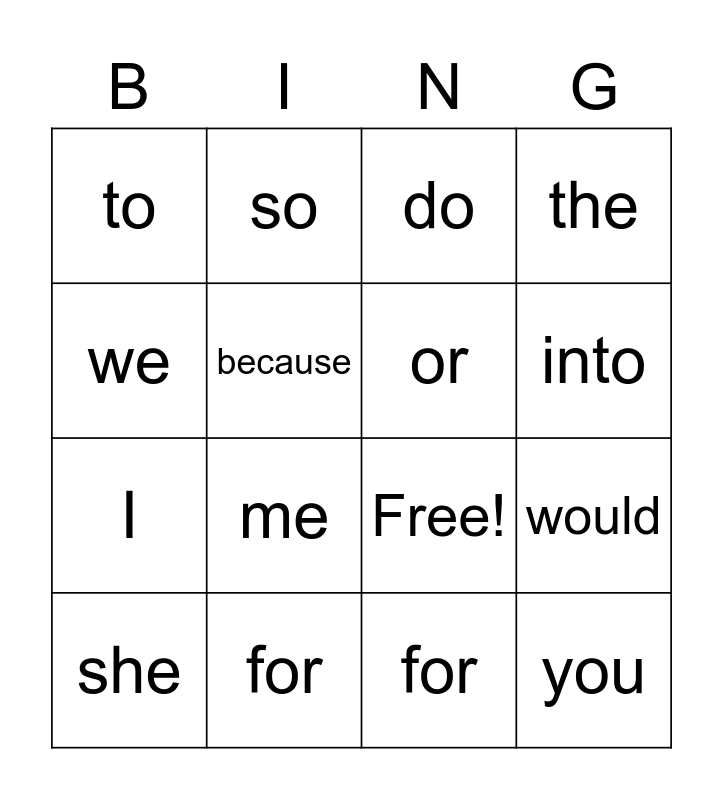 This bingo card has 21 words: for, go, so, no, for, or, to, do, Free!, into, I, the, you, us, because, be, she, me, we, would and put.