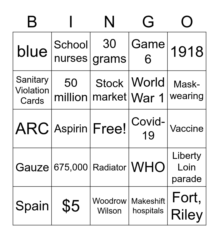 This bingo card has a free space and 24 words: Spain, 675,000, Stock market, Makeshift hospitals, 1918, blue, School nurses, 30 grams, Covid-19, Vaccine, ARC, 50 million, WHO, Liberty Loin parade, Sanitary Violation Cards, $5, Woodrow Wilson, Game 6, Mask-wearing, Gauze, Aspirin, Radiator, World War 1 and Fort, Riley.