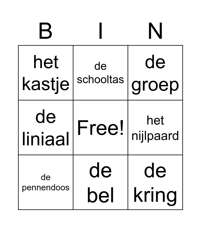 This bingo card has a free space and 10 words: de bel, de groep, het kastje, de kring, de liniaal, de pennendoos, de schooltas, de tand, het nijlpaard and de tijger.