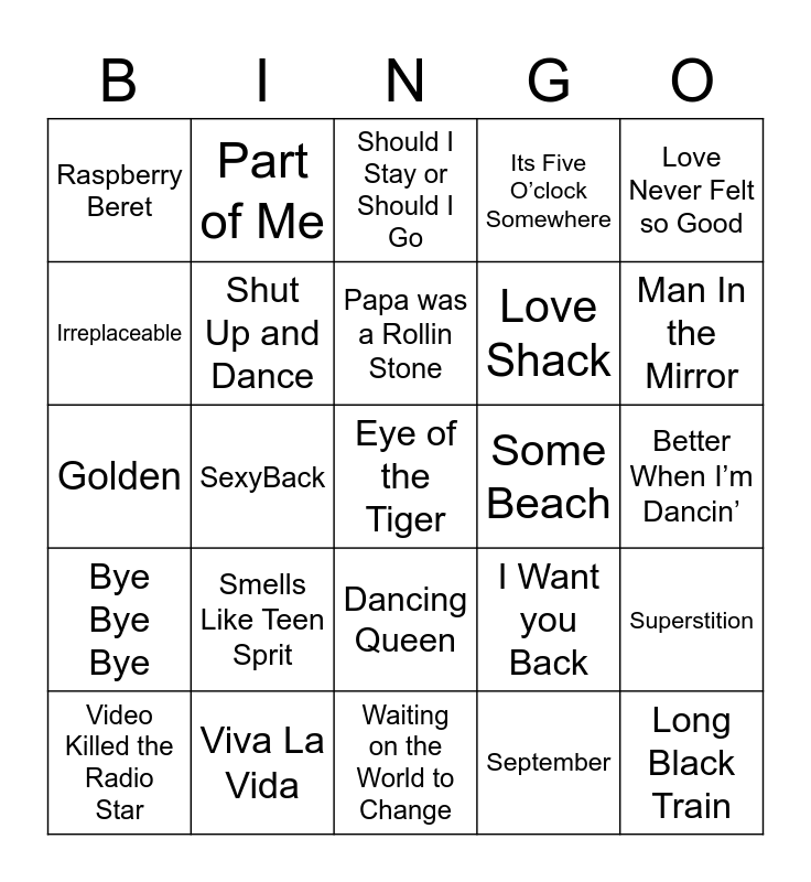 This bingo card has 49 words: Happier, Eye of the Tiger, Fat Bottomed Girls, Waiting on the World to Change, Smells Like Teen Sprit, Lifestyle, Part of Me, Nothin’ on You, Irreplaceable, Miss Independent, Shut Up and Dance, Its Five O’clock Somewhere, Superstition, I Want you Back, It’s a Great Day to be Alive, You Give Love a Bad Name, Papa was a Rollin Stone, Some Beach, Boondocks, Love Never Felt so Good, SexyBack, September, Raspberry Beret, Love Shack, Black Betty, Man In the Mirror, Video Killed the Radio Star, Man! I Feel Like a Women!, Dancing Queen, Bye Bye Bye, Girls Just Want to Have Fun, Beer Never Broke my Heart, Prayed For You, Singles You Up, Viva La Vida, Single Ladies, Hall of Fame, Whose Bed Have Your Boots Been Under, Better When I’m Dancin’, Under The Sea, Ramblin’ Man, The Joker, Long Black Train, Put Your Records On, Golden, Should I Stay or Should I Go, Budapest, Chocolate and Mean.