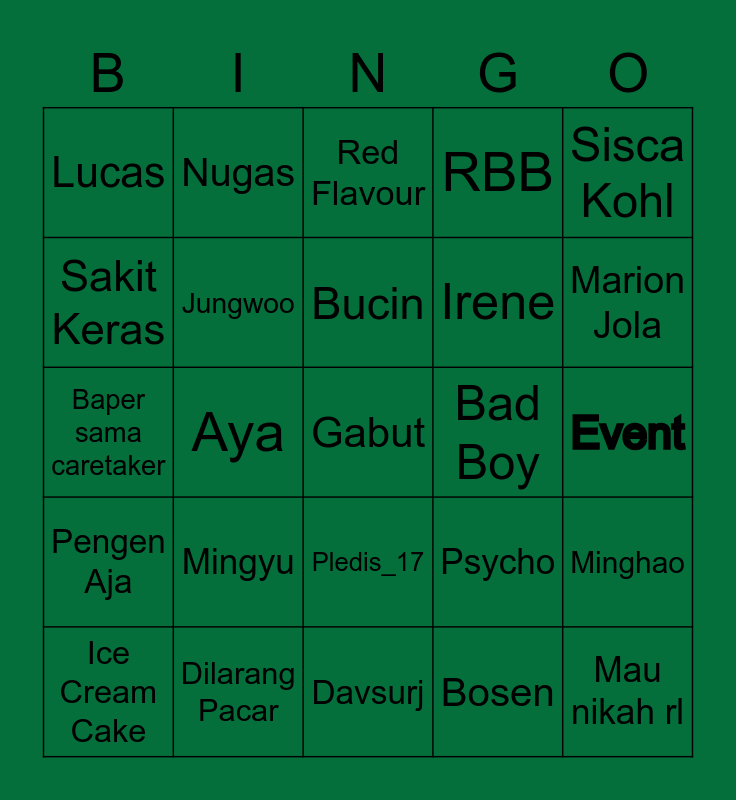 This bingo card has a free space and 24 words: Mingyu, Dilarang Pacar, Bucin, Ice Cream Cake, Sisca Kohl, Lucas, Sakit Keras, Nugas, Bad Boy, Pledis_17, Irene, Baper sama caretaker, Psycho, Minghao, Jungwoo, Bosen, Event, Red Flavour, Marion Jola, Aya, Mau nikah rl, Pengen Aja, RBB and Davsurj.