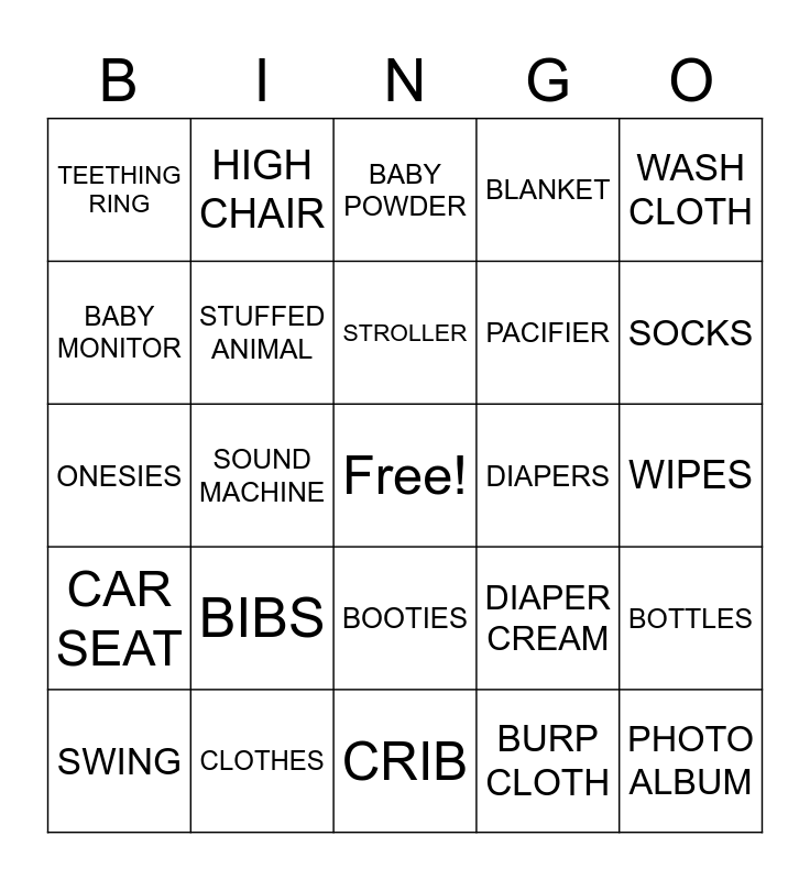 This bingo card has a free space and 24 words: BIBS, CLOTHES, STROLLER, SWING, WASH CLOTH, TEETHING RING, BABY MONITOR, HIGH CHAIR, DIAPERS, BOOTIES, PACIFIER, ONESIES, DIAPER CREAM, BOTTLES, STUFFED ANIMAL, BURP CLOTH, WIPES, BABY POWDER, SOCKS, SOUND MACHINE, PHOTO ALBUM, CAR SEAT, BLANKET and CRIB.