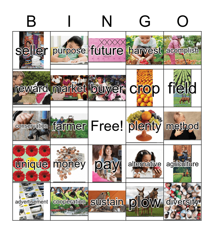 This bingo card has 24 images, a free space and 24 words: money, cooperation, buyer, advertisement, acomplish, seller, reward, purpose, plenty, pay, crop, conservation, alternative, agriculture, market, plow, method, future, field, farmer, diversity, unique, harvest and sustain.