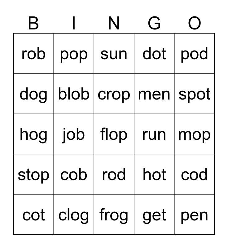 This bingo card has a free space and 24 words: cob, clog, crop, cot, pod, rob, dog, pop, run, rod, men, hog, hot, cod, blob, get, mop, sun, spot, job, pen, stop, dot and frog.
