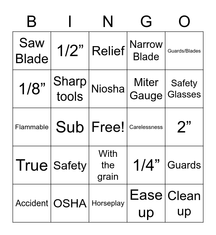 This bingo card has a free space and 24 words: Safety, OSHA, Niosha, Accident, Guards/Blades, Saw Blade, 1/8”, 1/2”, Carelessness, With the grain, Miter Gauge, Flammable, 1/4”, Guards, Sharp tools, Ease up, 2”, Relief, Safety Glasses, Sub, Clean up, True, Narrow Blade and Horseplay.