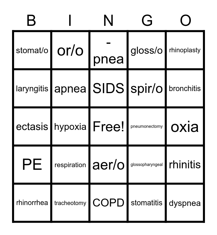 This bingo card has a free space and 30 words: pneum/o, tracheotomy, -pnea, pleurodynia, rhinoplasty, stomat/o, apnea, SIDS, spir/o, dyspnea, rhinorrhea, respiration, stomatitis, spirometer, PE, rhin/o, COPD, pneumonectomy, rhinitis, laryngitis, hypoxia, TB, gloss/o, oxia, ectasis, or/o, aer/o, glossopharyngeal, bronchitis and URI.
