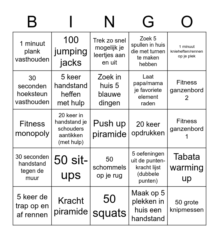 This bingo card has a free space and 24 words: 5 keer de trap op en af rennen, 50 sit-ups, Zoek in huis 5 blauwe dingen, Maak op 5 plekken in huis een handstand, 1 minuut knieheften/rennen op je plek, 1 minuut plank vasthouden, 100 jumping jacks, Trek zo snel mogelijk je leertjes aan en uit, 20 keer opdrukken, Fitness ganzenbord 1, Fitness monopoly, 5 keer handstand heffen met hulp, 5 oefeningen uit de punten-kracht lijst (dubbele punten), Tabata warming up, 30 seconden hoeksteun vasthouden, Kracht piramide, 50 squats, Zoek 5 spullen in huis die met turnen te maken hebben, Fitness ganzenbord 2, 30 seconden handstand tegen de muur, 20 keer in handstand je schouders aantikken (met hulp), 50 schommels op je rug, Laat papa/mama je favoriete element raden and 50 grote knipmessen.