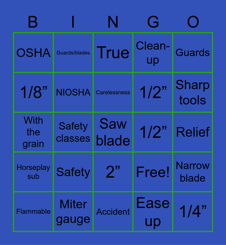 This bingo card has 25 words: Safety, Accident, Carelessness, Flammable, Guards, OSHA, 1/8”, Guards/blades, 1/2”, 2”, 1/2”, With the grain, Free!, Narrow blade, NIOSHA, 1/4”, Relief, True, Sharp tools, Safety classes, Saw blade, Miter gauge, Horseplay sub, Clean-up and Ease up.