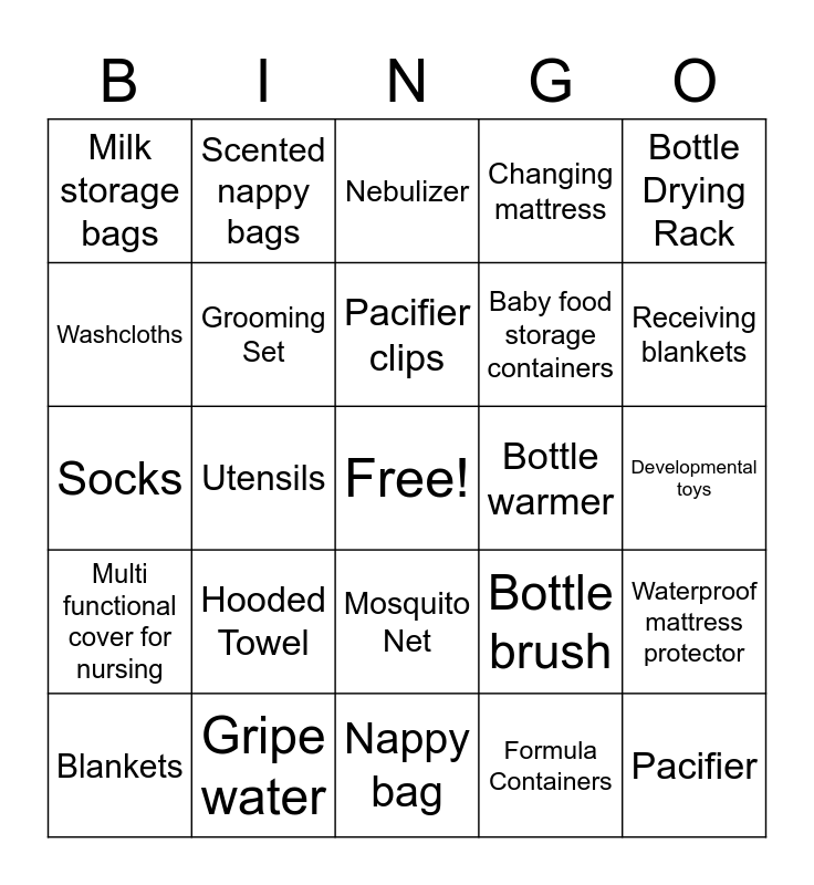 This bingo card has a free space and 48 words: Bibs, Pacifier, Pacifier clip, Nappy bag, Hooded Towel, Diaper bag, Scented nappy bags, Hooded bath towel, Washcloths, Comb & Brush Set, Grooming Set, Changing mattress, Waterproof mattress protector, Bottle brush, Bottles, Pacifiers, Pacifier clips, Bottle warmer, Bottle steamer, Bottle Drying Rack, Utensils, Formula Containers, Milk storage bags, Baby food storage containers, Swaddlings, Receiving blankets, Blankets, Baby carry wrap, Mosquito Net, Multi functional cover for nursing, Burp cloths, Bibs, Teethers, Medicine kit, Gripe water, Telament, Bumbo seat, Developmental toys, Baby carrier with hip seat, Roller sunshade, Floor/outdoor play mat, Humidifier and oil, Nebulizer, Night light, Socks, Vests, Shoes and Dress.