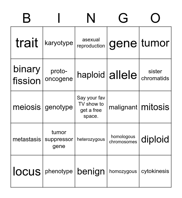 This bingo card has a free space and 24 words: tumor suppressor gene, phenotype, haploid, locus, tumor, trait, binary fission, karyotype, malignant, heterozygous, allele, meiosis, homologous chromosomes, diploid, proto-oncogene, homozygous, mitosis, asexual reproduction, sister chromatids, genotype, cytokinesis, metastasis, gene and benign.