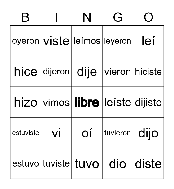 This bingo card has a free space and 24 words: vi, tuviste, dije, estuvo, leí, oyeron, hice, viste, leíste, oí, vieron, hizo, tuvieron, dijo, dijeron, dio, dijiste, leímos, hiciste, vimos, diste, estuviste, leyeron and tuvo.