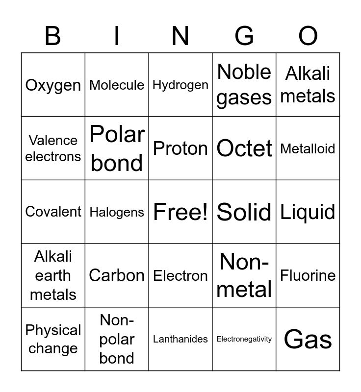 This bingo card has a free space and 40 words: Isotope, Covalent, Ionic, Polar bond, Non-polar bond, Electron, Proton, Neutron, Alkali metals, Alkali earth metals, Halogens, Noble gases, Gas, Liquid, Solid, Carbon, Nitrogen, Oxygen, Helium, Hydrogen, Fluorine, Electronegativity, Octet, Valence electrons, Reactant, Product, Atomic number, Mass number, Cation, Anion, Chemical change, Physical change, Metal, Non-metal, Metalloid, Lanthanides, Actinides, Atom, Molecule and Volume.