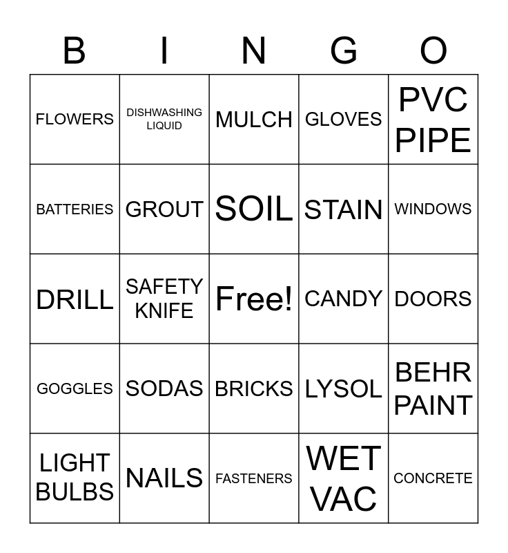 This bingo card has a free space and 24 words: SODAS, NAILS, SOIL, LIGHT BULBS, PVC PIPE, FLOWERS, BATTERIES, DISHWASHING LIQUID, CANDY, BRICKS, STAIN, DRILL, LYSOL, BEHR PAINT, GROUT, WET VAC, DOORS, MULCH, WINDOWS, SAFETY KNIFE, CONCRETE, GOGGLES, GLOVES and FASTENERS.