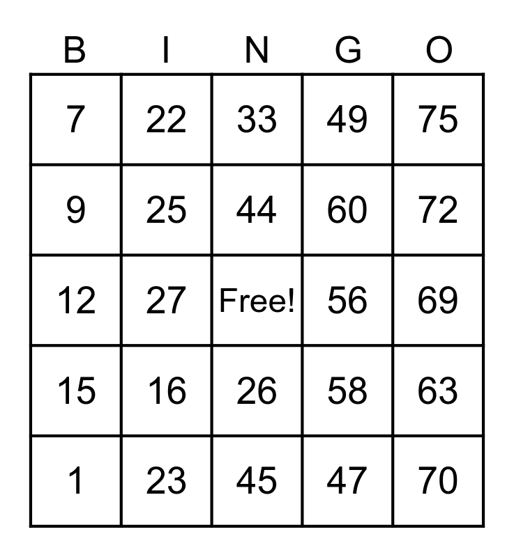 This bingo card has a free space and 24 words: 1, 16, 44, 47, 75, 7, 22, 33, 56, 69, 12, 25, 58, 63, 9, 23, 45, 49, 72, 15, 27, 26, 60 and 70.