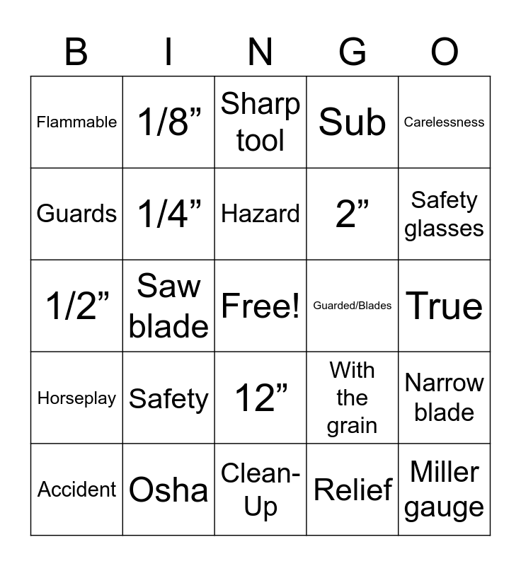 This bingo card has a free space and 24 words: Safety, Osha, Hazard, Accident, Carelessness, Flammable, Guards, 1/8”, Guarded/Blades, 12”, 2”, 1/2”, With the grain, Narrow blade, 1/4”, Relief, True, Sharp tool, Safety glasses, Saw blade, Miller gauge, Horseplay, Sub and Clean-Up.