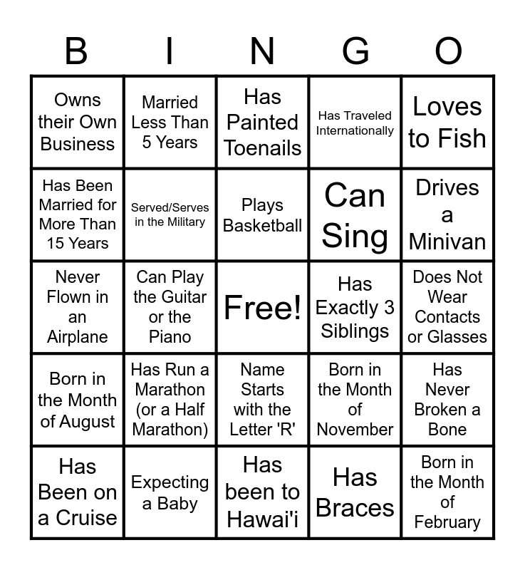 This bingo card has a free space and 60 words: Has Been Sky Diving, Expecting a Baby, Is Headed to College Year as a Freshman, Born in the Month of August, Has Braces, Has Lived in at Least 5 U.S. States, Served/Serves in the Military, Born in the 1980s, Can Sing, Left Handed, Has Traveled Internationally, Recently Started a New Job, Has Been Married for More Than 15 Years, Doesn't have a Facebook Account, Owns Horses or Other Livestock, Owns their Own Business, Born in the Month of February, Loves to Fish, Born Before 1950, Plays Basketball, Has Exactly 3 Siblings, Has Painted Toenails, Has Been on a Cruise, Has Never Broken a Bone, Plants a Garden, Prefers Pepsi to Coke, Prefers Coke to Pepsi, Is Over 6 Feet Tall, Drives a Minivan, Shares a Name with an Ancestor, Has Green Eyes, Born Outside of Idaho, Is not Computer Savvy, Has Traveled on a Train, Married Less Than 5 Years, Has Bigger Feet Than You, Can Speak a Foreign Language, Can Play the Guitar or the Piano, Has More Than 10 Grandchildren, Never Flown in an Airplane, Is a Grandfather, Has Run a Marathon (or a Half Marathon), Does Not Wear Contacts or Glasses, Graduated From High School this Year, Born in the Month of November, Has Hunted a Big Game Animal, Born Since 2000, Is in Middle School, Has a Non-Smart Phone, Name Starts with the Letter 'R', Has been to Hawai'i, Owns at Least 5 Guns, Enjoys Eating Sushi, Who Has Fainted/Thrown-Up in Public, Has had Stiches, Has Visited Another Continent, Travelled More Than 100 Miles to Be Here, Has a Name with 8 Letters in It, Has Read all 7 Harry Potter Books and Can Bake Homemade Break.