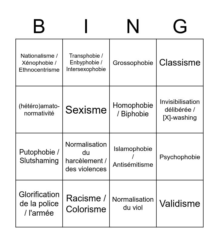 This bingo card has 16 words: Racisme / Colorisme, Psychophobie, Grossophobie, Nationalisme / Xénophobie / Ethnocentrisme, Putophobie / Slutshaming, Transphobie / Enbyphobie / Intersexophobie, Islamophobie / Antisémitisme, Normalisation du viol, (hétéro)amato-normativité, Sexisme, Glorification de la police / l'armée, Classisme, Normalisation du harcèlement / des violences, Invisibilisation délibérée / [X]-washing, Homophobie / Biphobie and Validisme.