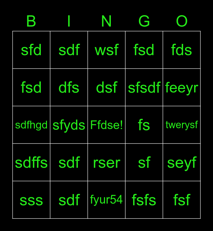 This bingo card has a free space and 24 words: sdf, sdf, dsf, sss, fds, sfd, fsd, sdf, fs, rser, sfsdf, sdfhgd, sf, seyf, dfs, fsfs, twerysf, wsf, feeyr, sfyds, fsf, sdffs, fsd and fyur54.
