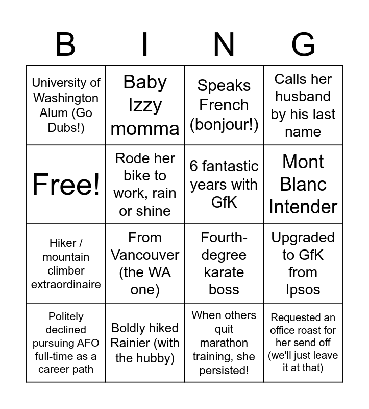 This bingo card has 16 words: Boldly hiked Rainier (with the hubby), Upgraded to GfK from Ipsos, Speaks French (bonjour!), University of Washington Alum (Go Dubs!), Hiker / mountain climber extraordinaire, Baby Izzy momma, Fourth-degree karate boss, When others quit marathon training, she persisted!, Free!, Rode her bike to work, rain or shine, Politely declined pursuing AFO full-time as a career path, Calls her husband by his last name, From Vancouver (the WA one), Mont Blanc Intender, 6 fantastic years with GfK and Requested an office roast for her send off (we'll just leave it at that).