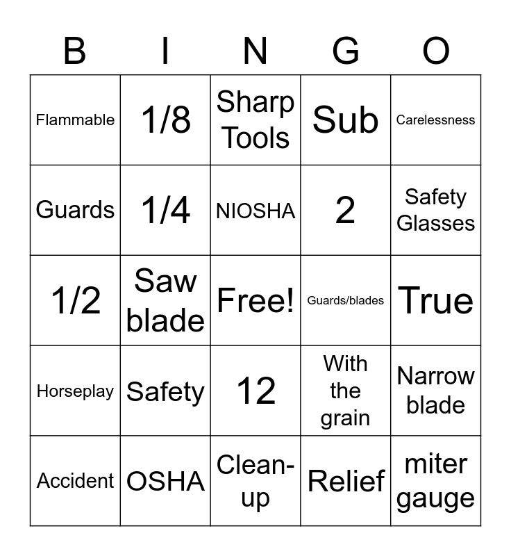 This bingo card has a free space and 24 words: Safety, OSHA, NIOSHA, Accident, Carelessness, Flammable, Guards, 1/8, Guards/blades, 12, 2, 1/2, With the grain, Narrow blade, 1/4, Relief, True, Sharp Tools, Safety Glasses, Saw blade, miter gauge, Horseplay, Sub and Clean-up.