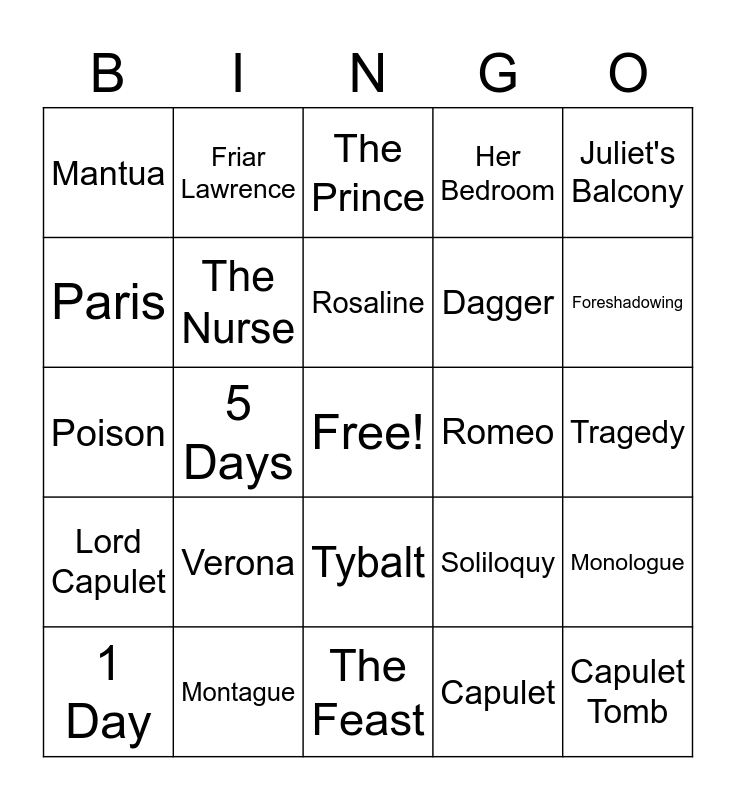 This bingo card has a free space and 24 words: Verona, Montague, Rosaline, 1 Day, Juliet's Balcony, Mantua, Paris, Friar Lawrence, Romeo, Tybalt, Dagger, Poison, Soliloquy, Monologue, The Nurse, Capulet, Tragedy, The Prince, Foreshadowing, 5 Days, Capulet Tomb, Lord Capulet, Her Bedroom and The Feast.