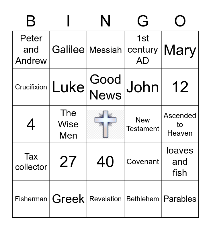 This bingo card has a free space and 24 words: 27, Greek, Good News, Fisherman, Mary, Peter and Andrew, Crucifixion, Galilee, New Testament, 40, John, 4, Covenant, loaves and fish, Luke, Bethlehem, Ascended to Heaven, Messiah, 12, The Wise Men, Parables, Tax collector, 1st century AD and Revelation.