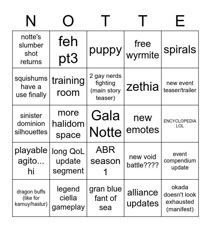 This bingo card has a free space and 24 words: long QoL update segment, legend ciella gameplay, 2 gay nerds fighting (main story teaser), dragon buffs (like for kamuy/hastur), spirals, notte's slumber shot returns, squishums have a use finally, feh pt3, new emotes, ABR season 1, zethia, sinister dominion silhouettes, new void battle????, event compendium update, training room, alliance updates, ENCYCLOPEDIA LOL, puppy, new event teaser/trailer, more halidom space, okada doesn't look exhausted (manifest), playable agito... hi, free wyrmite and gran blue fant of sea.