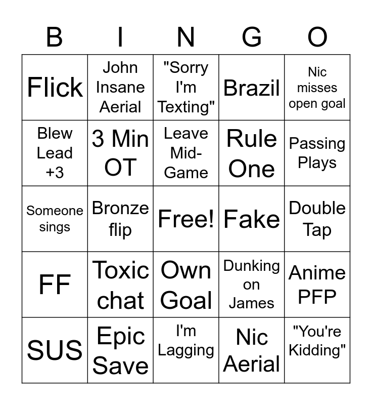 This bingo card has a free space and 24 words: Toxic chat, Epic Save, Leave Mid-Game, SUS, Nic misses open goal, Flick, Blew Lead +3, John Insane Aerial, Fake, Own Goal, Rule One, Someone sings, Dunking on James, Anime PFP, 3 Min OT, Nic Aerial, Double Tap, "Sorry I'm Texting", Passing Plays, Bronze flip, "You're Kidding", FF, Brazil and I'm Lagging.