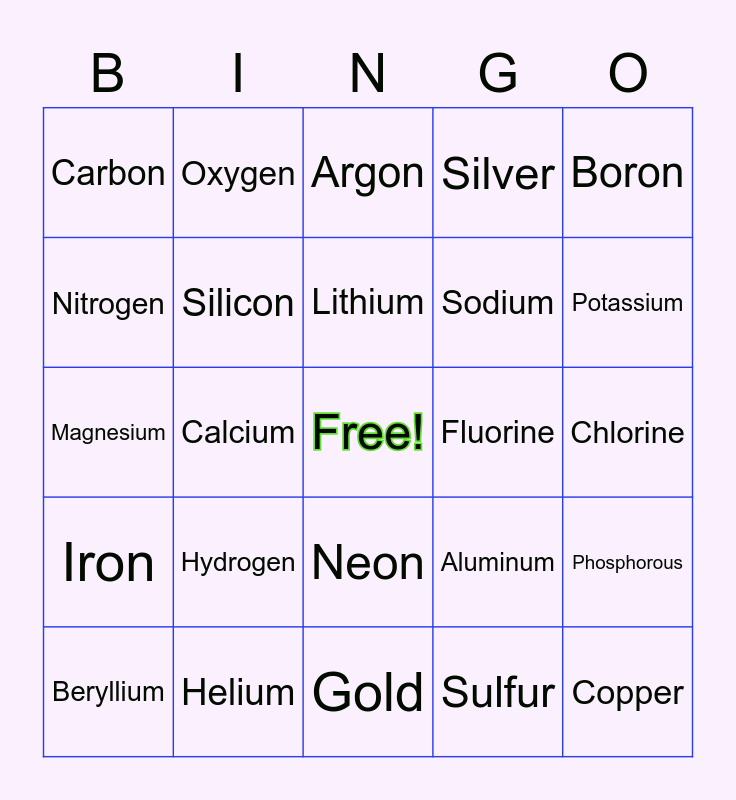 This bingo card has a free space and 24 words: Hydrogen, Helium, Lithium, Beryllium, Boron, Carbon, Nitrogen, Oxygen, Fluorine, Neon, Sodium, Magnesium, Aluminum, Phosphorous, Silicon, Sulfur, Chlorine, Argon, Potassium, Calcium, Copper, Iron, Silver and Gold.