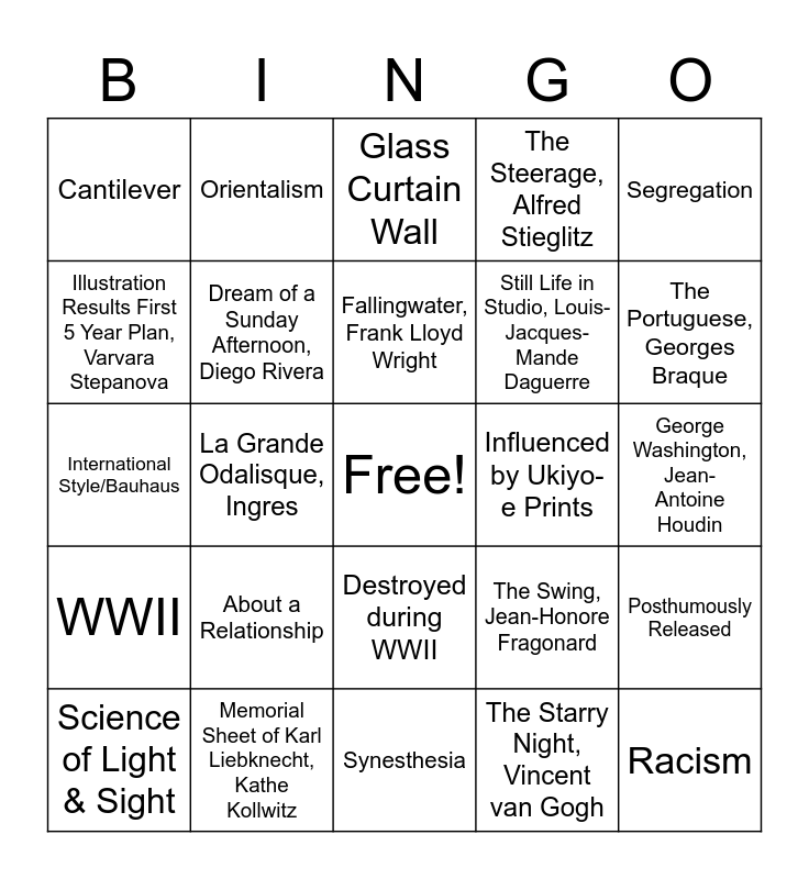 This bingo card has a free space and 140 words: The Orrery, Joseph Wright of Derby, Conversation Painting, Enlightenment, Science>Religion, Tenebrism, The Swing, Jean-Honore Fragonard, Rococo, Monticello, Thomas Jefferson, NeoClassical, American, French, Spanish, Dutch, German, Norwegian, Mexican, Self-Portrait, Female Artist, Elisabeth Louise Vigee-LeBrun, Y no hai Remedio, Francesco de Goya, Critical of Napoleon, Posthumously Released, Etching, Painting, Photograph, La Grande Odalisque, Ingres, Orientalism, Mannerism, Objectification, Liberty Leading the People, Eugene Delacroix, Greco-Roman Influence, French Revolution, The Oath of the Horatii, Jacques-Louis David, George Washington, Jean-Antoine Houdin, Contrapposto, Social Criticism, Anti-Slavery, Propaganda, Still Life in Studio, Louis-Jacques-Mande Daguerre, Slave Ship, Joseph Mallord William Turner, Palace of Westminster, Charles Barry & A.W.N.Pugin, The Stonebreakers, Destroyed during WWII, Realism, Gustave Courbet, Nadar Elevating Photography to Art, Honore Damier, Olympia, Edouard Manet, The Saint-Lazare Station, Claude Monet, Impressionism, Post-Impressionism, Expressionism, Color Field Painting, Science of Light & Sight, The Horse in Motion, Eadweard Muybridge, Stanford made a bet, The Valley of Mexico from the Hillside of Santa Isabel, Jose Maria Velasco, The Burghers of Calais, Auguste Rodin, Sculpture in the Round, Marble, Lost Wax Casting, Pivotal Work, The Starry Night, Vincent van Gogh, The Coiffure, Mary Cassatt, The Scream, Edvard Munch, WWI, WWII, Where do we come from? . . . , Paul Gauguin, Cultural Appropriation, Carson, Pirie, Scott & Co Building, Louis Sullivan, Form Follows Function, The House is a Machine for Living, Cantilever, International Style/Bauhaus, Mont Sainte-Victoire, Paul Cezanne, Painted 60 times, Proto-Cubism, Les Demoiselles d’Avignon, Pablo Picasso, Cubism, The Steerage, Alfred Stieglitz, Photography as Art, The Kiss, Gustav Klimt, Vienna Successionism, The Kiss, Constantin Brancusi, Primitivism, The Portuguese, Georges Braque, The Goldfish, Henri Matisse, Influenced by Ukiyo-e Prints, Improvisation 28, Vasily Kandinsky, Synesthesia, Abstraction, Pure Abstraction/NeoPlasticism, Dada, Self-Portrait as a Soldier, Ernst Ludwig Kirchner, Memorial Sheet of Karl Liebknecht, Kathe Kollwitz, Villa Savoye, Le Corbusier, Pilotis, Impasto, Flattened Picture Plane, Chaotic Composition, Composition with Red, Blue & Yellow, Piet Mondrian, Illustration Results First 5 Year Plan, Varvara Stepanova, Constructivism, Photomontage, Object, Meret Oppenheim, Fallingwater, Frank Lloyd Wright, Architect designed EVERYTHING inside too, Architecture should compliment environment, The Two Fridas, Frida Kahlo, European and Indigenous Cultural Contrast, About a Relationship, Surrealism, The Migration of the Negro, Jacob Lawrence, Segregation, Racism, The Jungle, Wilfredo Lam, Dream of a Sunday Afternoon, Diego Rivera, Mural, Political Work, Fountain, Marcel Duchamp?, Readymade, Appropriation, Woman I, Willem de Kooning, Commenting on Society, Seagram Building, van der Rohe & Johnson, Marilyn Diptych, Andy Warhol, Narcissus Garden, Yayoi Kusama, Installation or Performance Art, The Bay, Helen Frankenthaler, Fauvism, Lipstick of Caterpillar Tracks, Claes Oldenburg, Spiral Jetty, Robert Smithson, Earth Art, House in Newcastle County, Ventura, Rausch, Scott-Brown, Less is More, Less is a Bore, Glass Curtain Wall, Hogarth, Romanticism, Realism and German Expressionism.